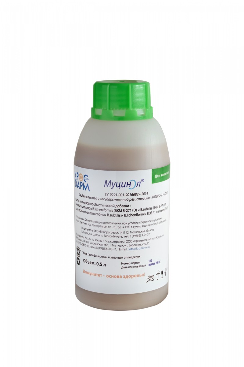 Пробиотик "МУЦИНОЛ" КЖ. Для выпойки индивидуально и групповым способом, обработки инкубационных яиц, оплодотворенной икры рыб, санации мест содержания производственных помещений. Расфасован во флаконы 500 мл.